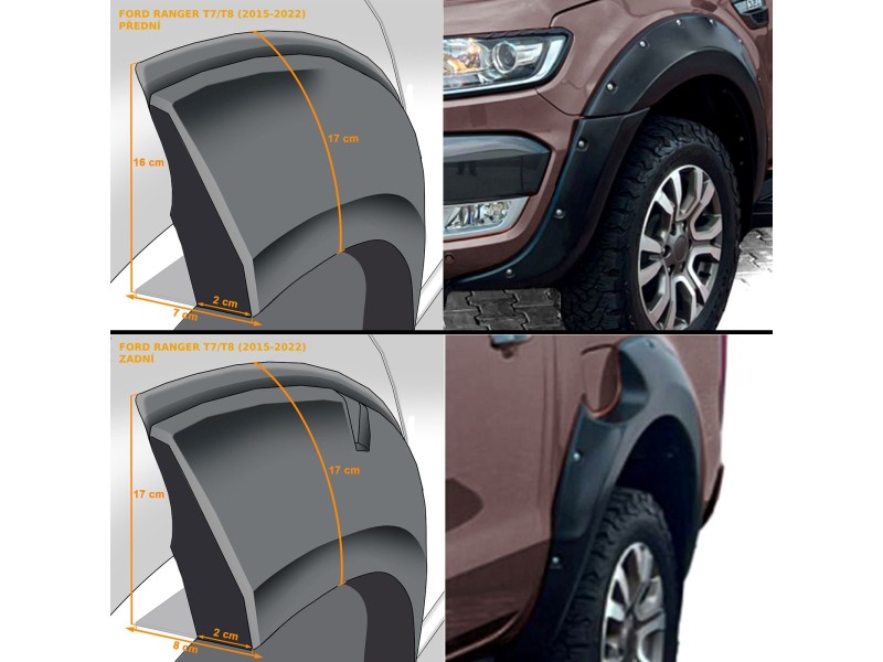 Plastové lemy blatníků pro Ford Ranger T7/T8 (rv. 2016-2021) s imitací šroubů